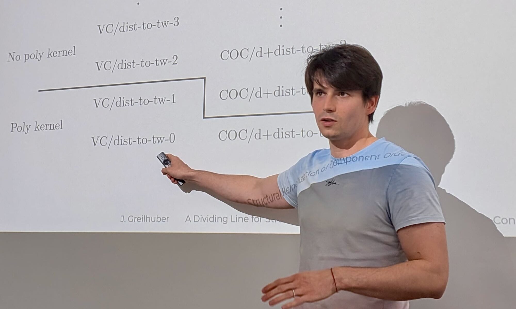 On October 28, 2025, Jakob Greilhuber from the CISPA Helmholtz Center for Information Security gave a talk at the Discrete Math Seminar on the parameterized complexity of the problem of deleting k vertices to make every component small. The title of his talk was “A Dividing Line for Structural Kernelization of Component Order Connectivity via Distance to Bounded Pathwidth“.