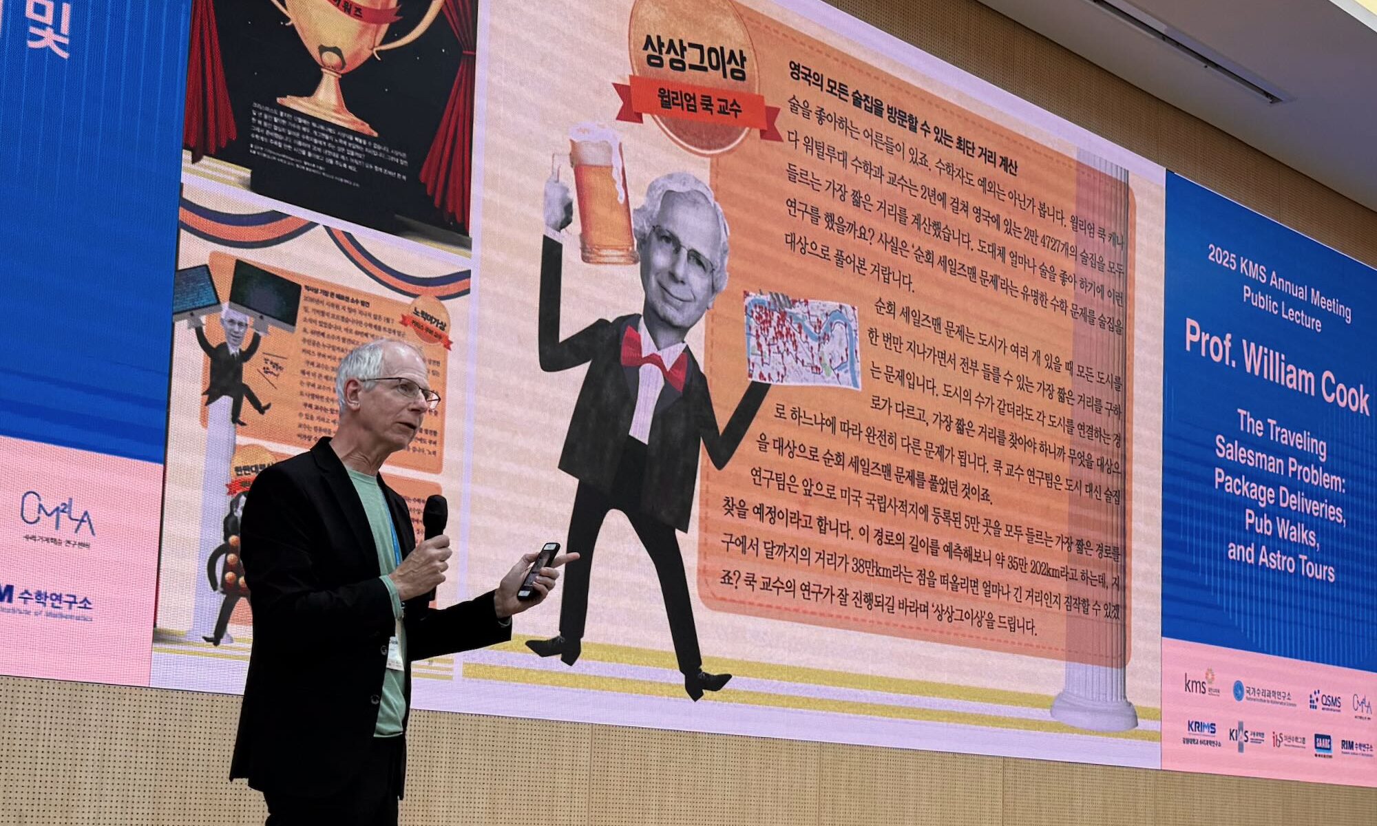 On October 22, 2025, William Cook from the University of Waterloo gave a public lecture on the traveling salesman problem at the ST Center, Seoul during the 2025 KMS Annual Meeting. The title of his talk was “The Traveling Salesman Problem: Package Deliveries, Pub Walks, and Astro Tours.” This public lecture was co-organized by the IBS Discrete Mathematics Group.