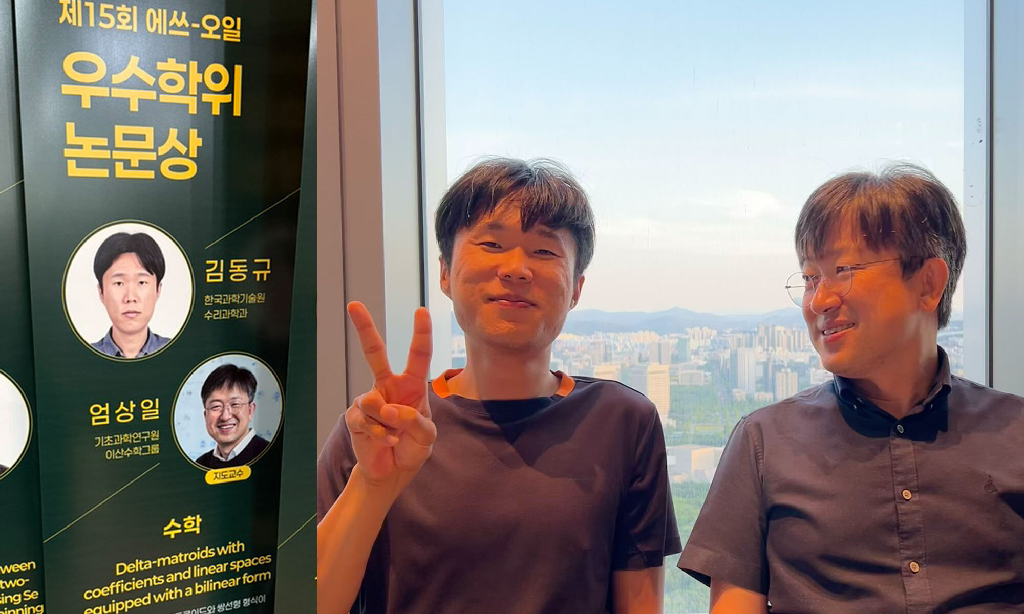 On November 26, 2025, Donggyu Kim (김동규) received the 15th S-OIL Excellent Dissertation Award (제15회 우수학위논문상) in Mathematics from the S-OIL Science Prodigy and Culture Foundation (에쓰-오일 과학문화재단), the Korean University Presidents Association (한국대학총장협회), and the Korean Academy of Science and Technology (한국과학기술한림원). This annual award recognizes young scientists in the fields of mathematics, physics, chemistry, life science, chemical engineering/material engineering, and IT.