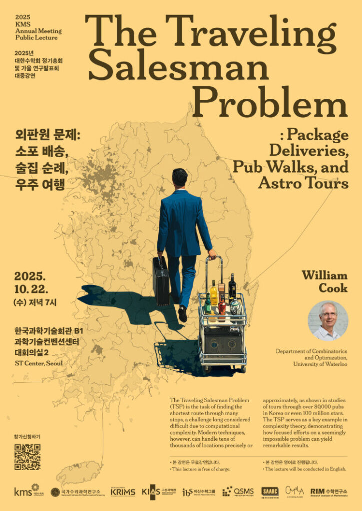 On October 22, 2025, William Cook from the University of Waterloo gave a public lecture on the traveling salesman problem at the ST Center, Seoul during the 2025 KMS Annual Meeting. The title of his talk was “The Traveling Salesman Problem: Package Deliveries, Pub Walks, and Astro Tours.” This public lecture was co-organized by the IBS Discrete Mathematics Group.